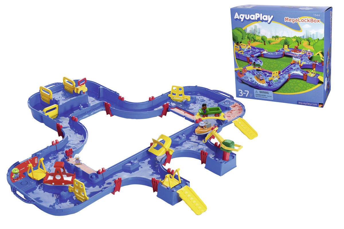 Die AquaPlay MegaLockBox bietet mit einer Länge von 160 cm und vier Spielstationen unendliche Spielmöglichkeiten für Kinder ab drei Jahren. Im Set enthalten sind eine Schleuse mit Handpumpe, ein Kran mit Container, eine Handkurbel mit Paddelflächen, eine klappbare Brücke, verschiedene Auffahrrampen, ein Fährboot, ein Amphibienfahrzeug, ein Containerboot, zwei Container und vier Spielfiguren. Gemeinsam mit Bo, dem Bären, Wilma, dem Hippo, Lotta, der Ente, sowie Nils, dem Frosch, lernen Kinder spielerisch das Element Wasser kennen und lernen, wie Strömungen entstehen, sich deren Richtung ändern lässt und Wasser Boote anhebt oder absenkt.