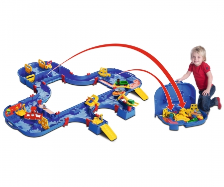 Am Containerhafen werden die Boote durch den Kran be- und entladen. Weiter geht die Fahrt durch das Kanalsystem bis zur Schleuse. Durch Pumpen gelangen die Boote nach oben und können problemlos die Schleuse passieren. Bei Ankunft im Fährhafen wird die Fähre zunächst sicher mit der Auffahrrampe fest verbunden. Jetzt können die Autos problemlos die Fähre verlassen oder auffahren. Mit der enthaltenen Handkurbel mit großen Paddelflächen können die Kinder leicht Strömungen erzeugen.