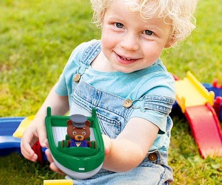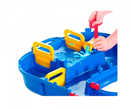 Im Set AquaPlay MegaBridge sind ein Hafenbecken mit Schleuse und Handpumpe, ein Kran mit Container, eine große Brücke mit klappbarem Innenteil, eine Handkurbel mit Paddelflächen, eine kleinere, klappbare Brücke mit Auffahrrampe, ein Containerboot mit Ladung, ein Amphibienfahrzeug und die Spielfigur Bo, der Bär enthalten. Durch die leicht zu drehende Handkurbel können die Kinder Strömungen erzeugen und ändern. Mit viel Spaß und Fantasie lernen sie dadurch das Element Wasser kennen.