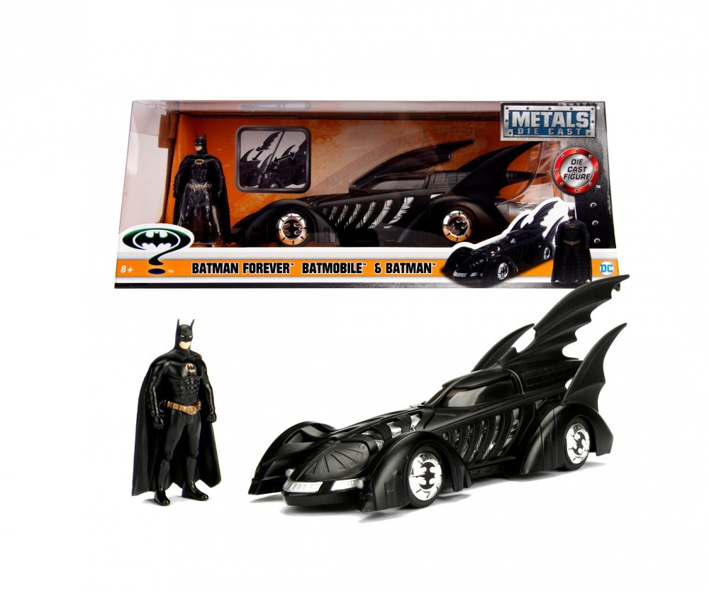 Keine Batman-Sammlung ist vollständig ohne das Batmobile von Batman Forever. Ausgestattet mit einer Zinkdruckgusskarosserie und Gummireifen ist dieses Batmobil im Maßstab 1:24 ein Muss in jeder Sammlung! Zu diesem Fahrzeug gehört auch eine 7cm-Zoll-Batman-Figur aus Zinkdruckguss. Altersempfehlung ab 8 Jahre
