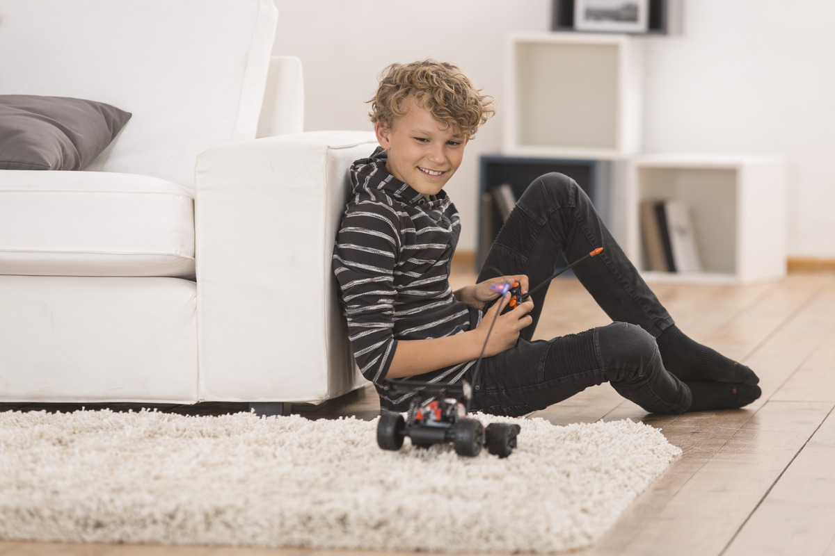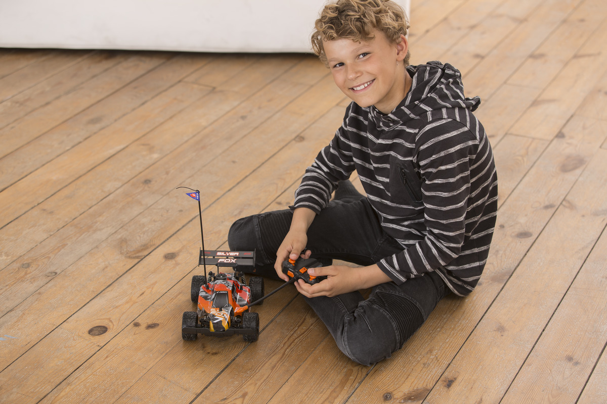 Mit einem Buggy lassen sich Autorennen auf die spritzige Art inszenieren. Der Dickie Toys RC Silver Fox ist so ein wendiger Flitzer und startet dank der mitgelieferten Batterien direkt durch. Mit der Lenkungsfeineinstellung am Fahrzeug hält er leicht seine Spur. Bis zu 8 km/h schnell saust er funkferngesteuert über viele Untergründe. Die Hochleistungsreifen sorgen dabei für den notwendigen Grip. Durch die Federung zeigt das Auto besonders bei kniffligen Parcours, wie ein Rennwagen zu fahren hat. Die schlagfeste Stoßstange und die PVC Karosserie verzeihen problemlos, wenn es den Wagen einmal aus der Kurve trägt. Immer nur geradeaus wäre ja langweilig. Düsen Sie los!