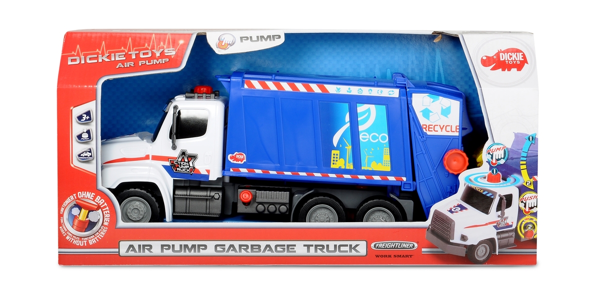 Freightliner, Müllauto, Freilauf, Luftpumpfunktion, mit Abfallcontainer, ca. 32 cm. 1:24.