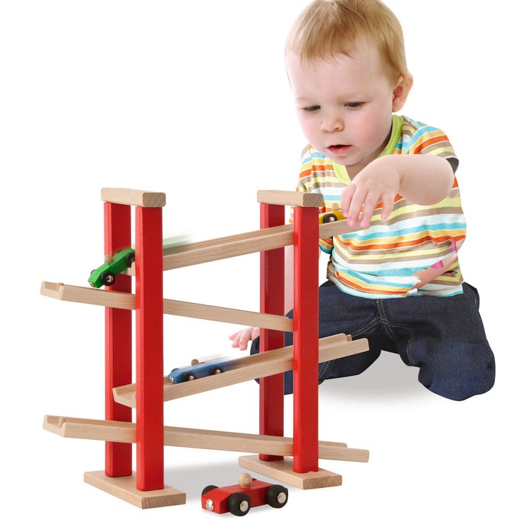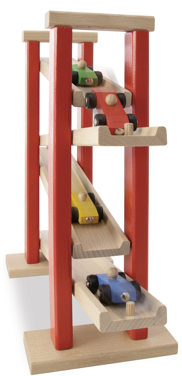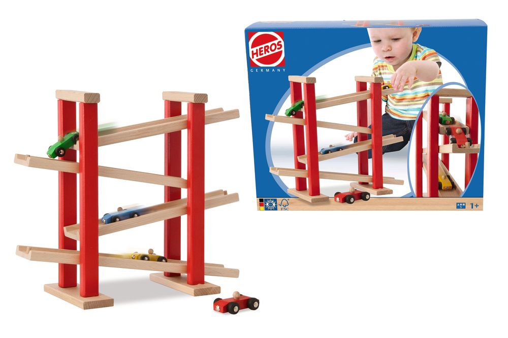 Die Auto-Rennbahn von Eichhorn / Heros mit den vier Etagen sieht klasse aus und ist für Kinder eine wunderbare Beschäftigungsmöglichkeit. Die Rennautos starten auf der obersten Ebene und fahren dann von selbst im Zick-Zack alle 4 Etagen nach unten.