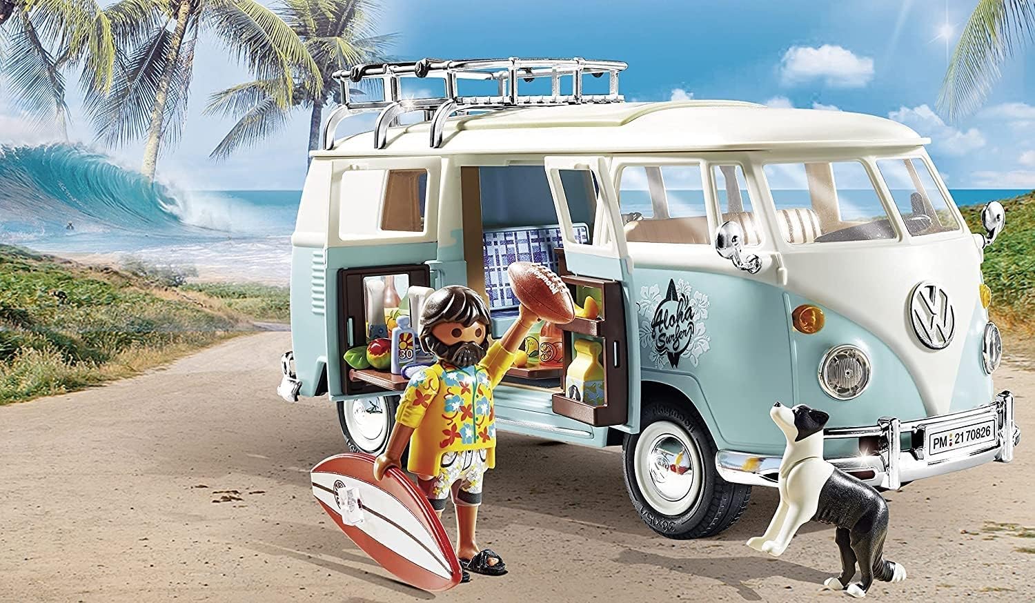 Aloha Surfers, her mit dem ''California-Feeling'' - der Kultbulli als hellblauer Surfer-Van fährt vor: Der PLAYMOBIL Volkswagen Camping Bus T1 im Kleinformat verspricht in seiner Special Edition nicht nur Freiheit auf 4 Rädern, sondern echte Urlaubsvibes. Mit seinem ikonischen Design, dem großen VW-Logo auf der Front, der speziellen blauweißen Farbtrennung sowie Einzelteilen in Chrom-Optik geht es mit dem VW T1 nun auch im eigenen Wohnzimmer auf Abenteuerreise. Genau wie beim Original aus den 50er und 60er Jahren begeistert das Spielzeugauto von PLAYMOBIL mit liebevollen Details und coolen Funktionen: Sitzbänke im typischen Karomuster, eine Mini-Küche mit Klapptisch und was wäre der VW Bus schon ohne eine umklappbare Rückbank? Jetzt nur noch flott das Surfbrett auf dem Dachgepäckträger festschnüren, und schon kann die Fahrt beginnen! Zahlreiche Extras und die PLAYMOBIL-Surferfigur sorgen für authentischen Spielspaß, endlose Roadtrips und Sammelfreude pur für Fans des Kultautos.