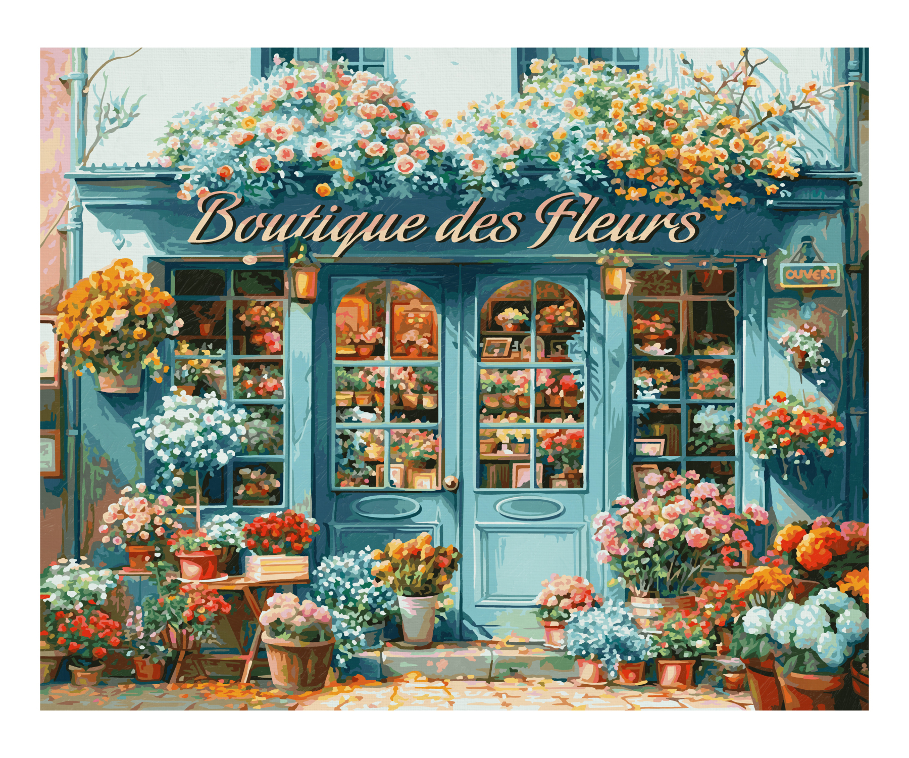 Ein Spaziergang durch eine kleine französische Gasse und plötzlich steht man vor ihr: Einer charmanten Boutique, die überquillt vor duftenden Blüten und lebendiger Farbenvielfalt. Das Malen-nach-Zahlen-Motiv „Blumenladen" bringt diese Atmosphäre direkt nach Hause. Die üppige Auslage, die fein gearbeiteten Fensterdetails und das typische Pariser Blau der Fassade machen dieses Motiv zu einem echten Blickfang für alle, die sich beim Malen gerne in andere Welten träumen.